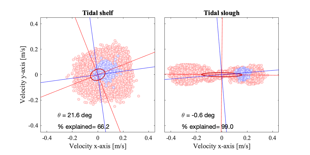 Examples of measured velocities from two ADVs highlighting that their x-axis may be un-aligned with the flow's principal components. The blue dots and lines (direction of principal axes) are for a 5-min subset of the entire timeseries (about a day's worth).